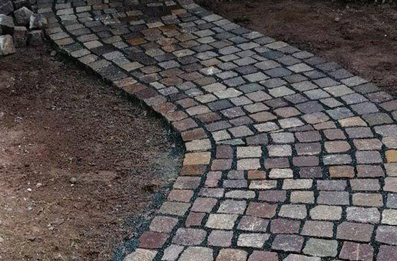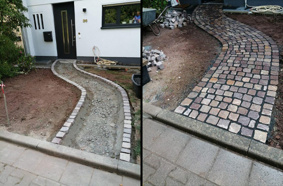 Der Weg zur Haustür gibt den ersten Eindruck - hier haben wir den Weg mit unterschiedlich farbigen Pflastersteinen angelegt und einen Akzent durch den Schwung gesetzt.